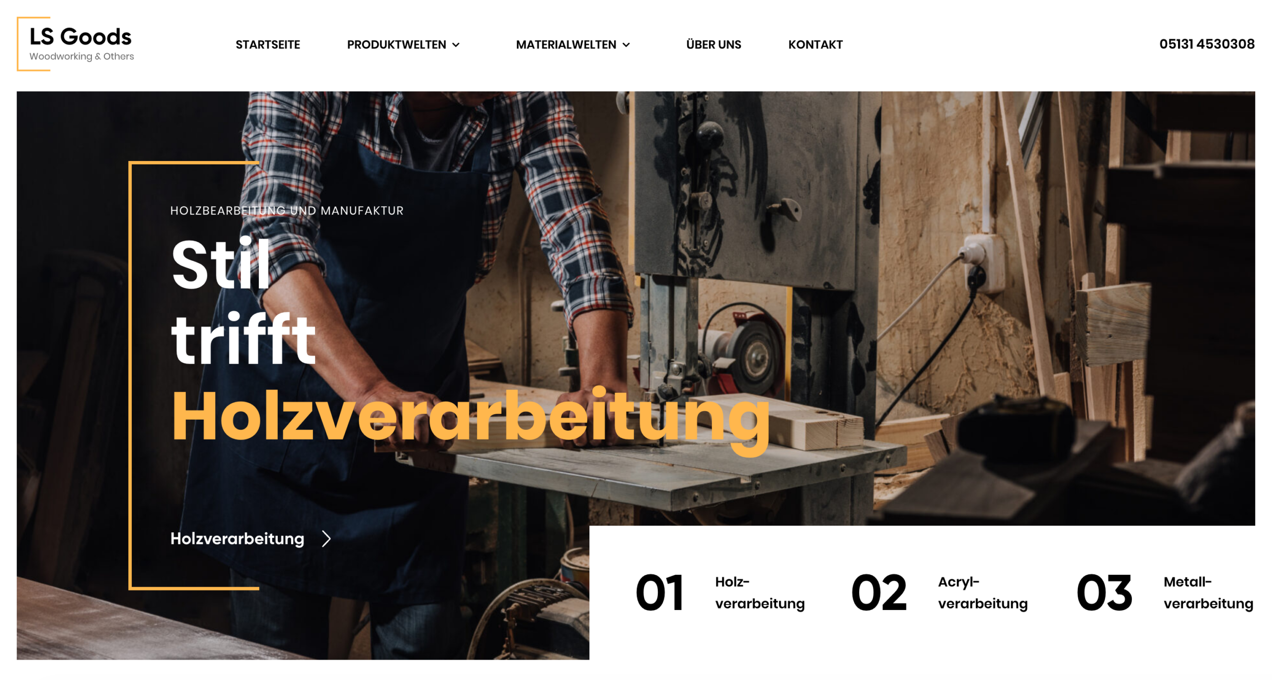 Das komplexe Angebot wurde in glasklare Leistungsbereiche zerlegt — Holz-, Acryl- und Metallverarbeitung. Der Nutzer weiß in den ersten Sekunden, wo er klicken muss.